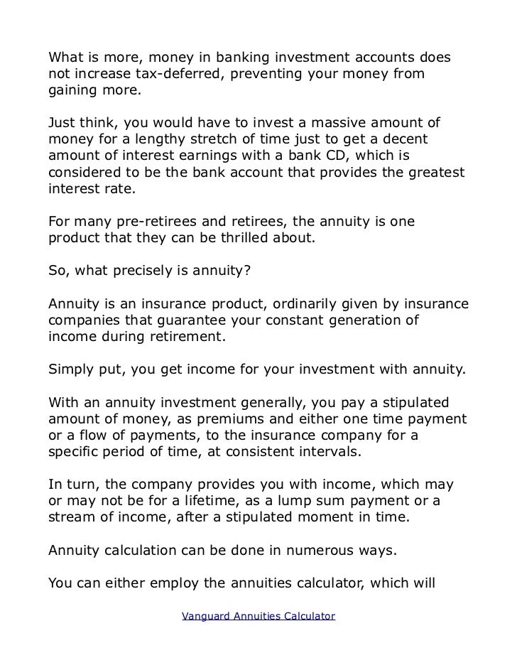 Now derived from the sale of annuities. (1982 marked the first year in which an-nuity reserves exceeded life-insurance re-serves.) Today, the industry’s annuity re-serves are about twice as large as its life- Vanguard annuity will have tracked the ... Doc Viewer