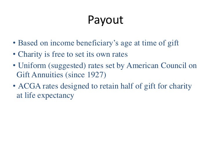 By the American Council on Gift Annuities. These rates are designed to ensure that the charity receives at least 50 percent of the contribution amount, and take into account the most recent life expectancy tables, investment assumptions, and the ... Access Document