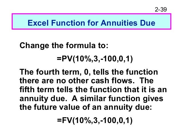 Continuing payments involve annuities 3 – If account is increasing in value - future value problem – If account is decreasing in value Calculate present value of an annuity Understand amortization Be able to compute unpaid balances and equities 6. ... Read Full Source