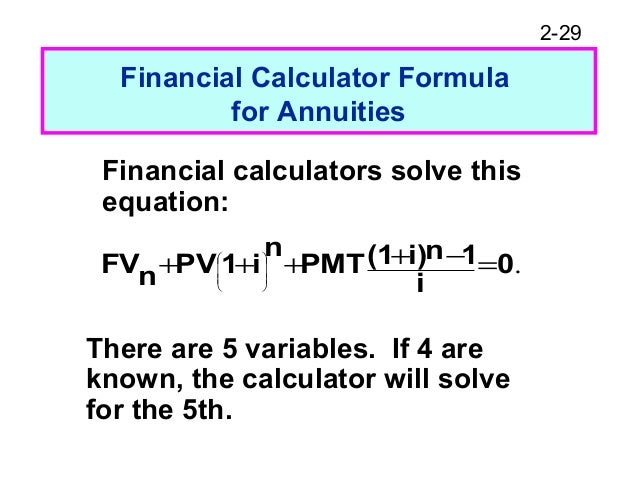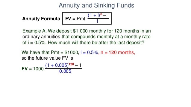 Sample problems from Chapter 10.1 This is the annuities sinking funds formula. This formula is used in most cases for annuities. The payments for this formula are made at the end of a period. Your book likes to use tables which ... Retrieve Document