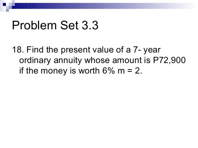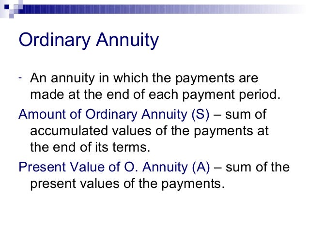 Annuities whose payments are made at the end of the period are called ordinary annuities. compounding period are called simple annuities . Example 1: Find the future value of an ordinary annuity with $150 monthly ... Fetch Full Source